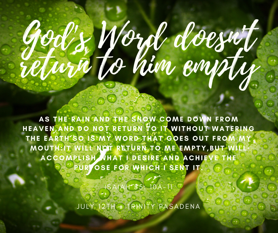 This week we encounter one of the most beautiful texts in the Old testament as it likens the circle journey of the Word of God, to the circle journey of rain and snow in creation as it comes to water and sustain life, returning to the heavens from whence it came. As the final verses of chapter 55 these creation pictures draw on a rich history in the Scriptures of the Word breathing life and making new all things. But it is also comforting and quite mysterious too how God’s Word manages in fact to work its way through and into our world and returning back to him like a boomerang; having done some quite profound things on its journey. Things that may even be entirely hidden to us but known only to God.